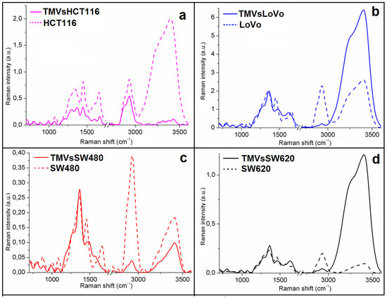 The acquired Raman spectra showed differences in the intensity values as well as in the shape of the spectra between the respective cell lines and TMVs released by them. In the spectra obtained for the HCT116 cells, the Raman intensities in the analyzed range were higher than for their TMVs (Figure 4a). Moreover, differences in the shape of the spectra, especially in the Raman shift between 1250 cm−1 and 1450 cm−1 (protein functional groups range) and between 3000 cm−1 and 3500 cm−1, were noticed when we compared the TMVsHCT116 and the HCT116 cell lines. When comparing LoVo (Figure 4b) and SW620 (Figure 4d) cells with their TMVs, the Raman intensities in the ranges between 800 cm−1–1400 cm−1 and 2700 cm−1–3000 cm−1 were higher for cells, while in the ranges of 1400 cm−1–1700 cm−1 and 3000 cm−1–3500 cm−1 were higher for TMVs. In the case of SW480 cells and their TMVs (Figure 4c), higher Raman intensities in all analyzed ranges were seen in the spectrum of TMVSW480. Between LoVo and SW480 cells and their corresponding TMVs, we observed differences in the shape of the spectra and peak shifts in the Raman range corresponding to protein vibrations (1400–1700 cm−1). Moreover, in the Raman spectra of SW480 cells and TMVSW480, differences in the shape of the spectra and peak shifts originating from DNA, phospholipids, and protein vibrations (800–1100 cm−1) were visible. Furthermore, in the Raman spectra of TMVHCT116 and TMVSW620, absence of the peak corresponding to the C–H groups from cholesterol and cholesterol ester were noticed in comparison to their respective cell lines. The peaks originating from the stretching vibrations of the CH, NH, and OH groups were not observed in the Raman spectrum of the LoVo cell line in comparison with the Raman spectrum of the TMVLoVo. The identified peaks are described in detail in Table 1 for all the obtained spectra.
