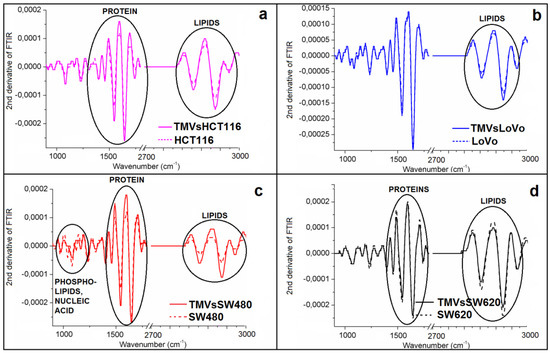 To obtain information about the differences in the structure between cell lines and the corresponding TMVs released from them, the second derivative of the FTIR spectra was calculated (Figure 5). However, we obtained the second derivative of the FTIR spectra not for the entire IR range measured, but only for the regions of nucleic acids and phospholipids (~900–1250 cm−1), proteins (~1250–1700 cm−1), and lipid (~2700–3000 cm−1) vibrations, respectively.