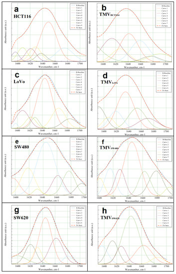 Deconvolution of amide I FTIR region (1700–600 cm−1) obtained for cell lines: (a) HCT116; (b) TMVHCT116; (c) LoVo; (d) TMVLoVo; (e) SW480; (f) TMVSW480; (g) SW620 and (h) TMVSW620. Curves 1–8 show the matched Gaussian functions and fit sum-results obtained by the matched Gaussian functions.