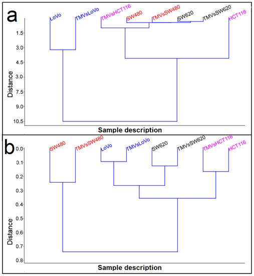 Cluster analysis performed from the Raman (Figure 7a) and FTIR measurements (Figure 7b) showed two main groups. However, depending on the method, the components in these groups were different. It is very interesting that for both Raman and FTIR spectroscopy, the TMVs were similar to their respective cell lines. Moreover, HCA analysis obtained from Raman data showed very high similarities between the SW480 and SW620 cell lines and the TMVs collected from them (the lowest value of Euclidean distance), while HCA analysis obtained from the FTIR data showed that SW620 cells and TMVSW620 were more similar to LoVo cells and TMVLoVo (Euclidean distance around 0.25). When we compared Euclidean distance in HCA obtained for Raman and FTIR data, the lower value of this parameter was in FTIR HCA analysis (Figure 7b), which means, that FTIR spectra of the measured samples were more similar to each other than the Raman spectra. Moreover, the value of the Euclidean distance (~10.5) for the LoVo cells and TMVLoVo in HCA analysis for Raman suggest that the chemical composition of these two samples was the most different to the other six samples.