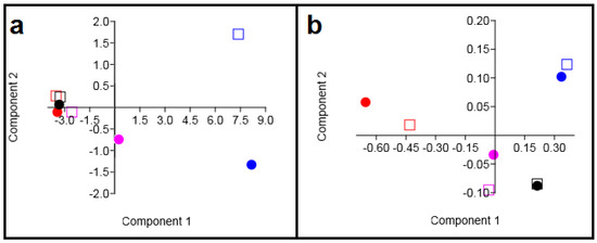 Principle component analysis of HCT116 (violet), LoVo (blue), SW480 (red), and SW620 (black) cell lines (dot) and their corresponding, released TMVs (square). Two-dimensional (2D) score plots of the cell line samples presented for the spectroscopy data: Raman (a) and FTIR (b).