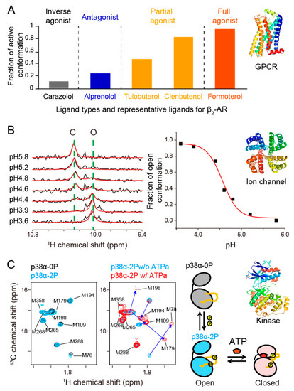 Examples of functional dynamics revealed by NMR. (A) Conformational equilibrium as quantified by NMR explains the efficacy of β2-AR agonists. The fractions of active conformation were obtained from Kofuku et al. [6]. (B) The conformational equilibrium revealed by NMR explains the gating properties of KcsA. Left panel: The conformational equilibrium observed in the Trp-113 signal reflects the gating of lower gate in KcsA [25]. Right panel: pH dependence of the fraction of open conformation deduced from the fitting of the Trp-113 signal. The acid dissociation constant, pKa, value of intracellular gate opening, pH 4.6, obtained from NMR, was identical to the reported pKa value obtained from electrophysiological measurements [26]. (C) Conformational equilibrium revealed by NMR explains the activation of kinase p38α. Left panel: The methionine methyl signals observed in the NMR spectrum indicate that dual phosphorylation is not sufficient to form the active closed conformation of p38α and that ATP is required to induce the closed conformation [27]. p38α-0P, p38α-2P, and ATPa refer to unphosphorylated p38α, dually-phosphorylated p38α, and the ATP analog, respectively. Right panel: schematic representation of the conformational state of p38α in each condition.