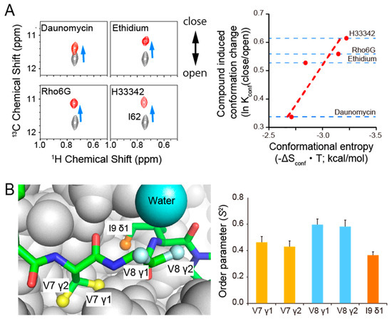 The enhancement of dynamics upon binding to compounds is also considered to contribute to the improvement of ligand affinity [107]. We have shown that promiscuous but high-affinity recognition of a multidrug binding transcriptional repressor is dictated by conformational entropy in the multidrug binding protein lincomycin resistance repressor LmrR, which serves as a sensor for toxic compounds in bacteria [108]. Compounds binding to LmrR resulted in a notable increase in the amplitude of psec–nsec dynamics at the interface between the compound-binding and DNA-binding domains, which points to an allosteric coupling of these sites [108]. The conformational entropy associated with these changes in dynamics corresponded to −2~−3 kcal/mol, thereby favorably contributing to the high affinity but promiscuous binding of the multi-drug binding transcriptional regulator. The compound-binding site of LmrR exhibits μsec–msec dynamics in the apo state, and compound ligation shifts this pre-existing conformational equilibrium to varying extents. It should be noted that the conformational entropy gain associated with compound binding shows significant correlation with the extent of the compound-induced changes in the conformational equilibrium (Figure 3A). Therefore, the conformational equilibrium of the protein that allows promiscuous ligand binding is directly coupled to a high affinity interaction via conformational entropy.