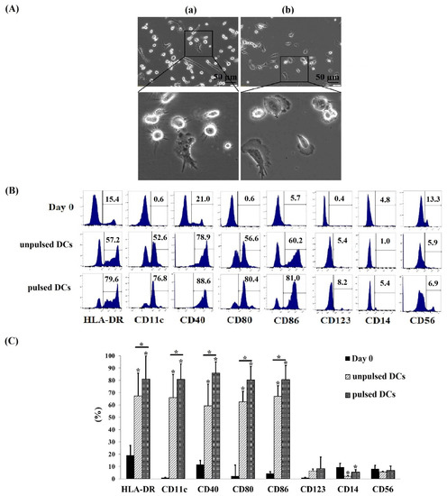 To analyze the surface phenotype of pulsed and ulpulsed DCs, the cells were characterized by flow cytometry using fluorescently labeled antibodies against human leukocyte antigen D-related (HLA-DR), cluster of differentiation (CD)14, CD11c, CD40, CD56, CD80, CD86, and CD123. Compared to CBMCs at day 0 of cell culture, pulsed DCs and unpulsed DCs at day seven consistently showed an increase expression level of DC markers such as HLA-DR, CD11c, CD40, CD80, and CD86, and low expression of monocyte markers such as CD123, CD144, and CD56 (p < 0.05) (Figure 1B). The percentage of cells expressing DC markers was significant higher in pulsed DCs when compared to unpulsed ones (p < 0.05). The pulsed DC population expressed DC markers were high on most cell culture such as HLA-DR: 81.0 ± 18.7%, CD11c: 80.9 ± 12.4%, CD80: 80.4 ± 29.1%, CD40: 85.9 ± 9.1%, and CD86: 80.6 ± 16.8% (Figure 1C). This indicated that mature DCs have been generated successfully from cryo CBMCs.