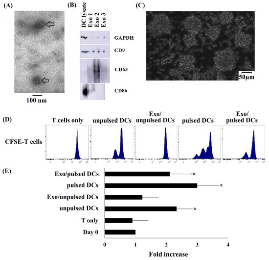 DCs and their exosomes induced allogeneic T cell proliferation. (A) A cup-shaped morphology was observed for pulsed DC-derived exosomes by TEM. (B) Pulsed DC-derived exosomes expressed CD9, CD63, and CD86. (C) AlloT cells grew as clumps when incubated with pulsed DCs. (D) Carboxyfluorescein succinimidyl ester (CSFE)-stained T cells proliferated during a seven-day incubation with pulsed DCs, unpulsed DCs and exosomes isolated from DCs. Untreated T cells or T cells incubated with exosomes isolated from Exo/unpulsed DCs did not divide. (E) The number of T cells increased highest in the treatment with pulsed DCs, followed by Exo/pulsed DCs, and unpulsed DCs. Exo/unpulsed DCs showed no significant effect on alloT cell proliferation. Data was presented as mean ± SD in quadruplicate cultures (* p < 0.05). Exo1: pulsed DC-derived exosome sample 1; Exo2: pulsed DC-derived exosome sample 2; Exo3: pulsed DC-derived exosome sample 3. DCs: dendritic cells; pulsed DCs: A549 tumor cell lysate-pulsed DCs; unpulsed DCs: A549 tumor cell lysate-unpulsed DCs; Exo/unpulsed DCs: exosomes isolated from unpulsed DCs; Exo/pulsed DCs: exosomes isolated from pulsed DCs.