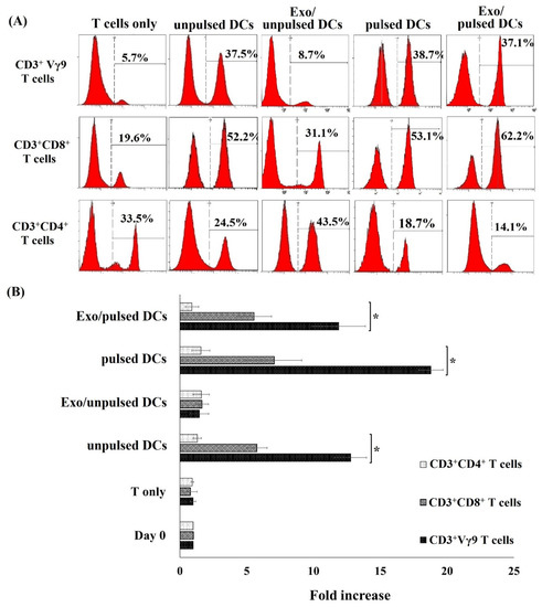 The proliferation of allogeneic T cell subsets was also evaluated. The purified T cells were mixed with DCs or DC-derived exosomes were at a ratio of 1 DC:4 T cell in a total volume of 1 mL KBM medium containing 50 U/mL IL-2 per well and cultured for four days at 37 °C and 5% CO2. The DC-derived exosome concentration that is equivalent to the number of secreting DCs were used to pulse the T cells (exosomes equivalent to 1 parental DCs:4 T cells). After incubation, the floating cells were collected and stained with monoclonal antibodies against CD3, CD8, Vγ9TCR, and CD4 conjugated with Pacific Blue, FITC, APC Vio, and PC7 (Beckman Coulter, Marseille, France). Cells then were analyzed on BD FACScanto II system, and the data were acquired with BD FACSDivaTM software (San Jose, CA, USA).