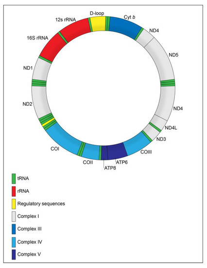 It is now well-established that the human mtDNA is a circular molecule of 16,569 bp, composed of 37 genes, of which 13 encode proteins, 22 tRNAs and two rRNAs [24] (Figure 1). It also presents non-coding regions, such as displacement loop (D-loop), responsible for controlling mtDNA replication and transcription [25].