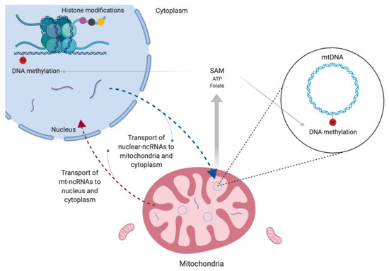 Mitochondrial epigenetics. Scheme showing the occurrence of DNA methylation in mtDNA and of non-coding RNAs (ncRNAs) inside mitochondria. These ncRNAs are encoded by both nucleus and mitochondrial genomes and participate of the nuclei–mitochondria communication. Mitochondrial metabolism is responsible for the production of the universal methyl donor (SAM), which is used in all DNA methylation events in a cell.