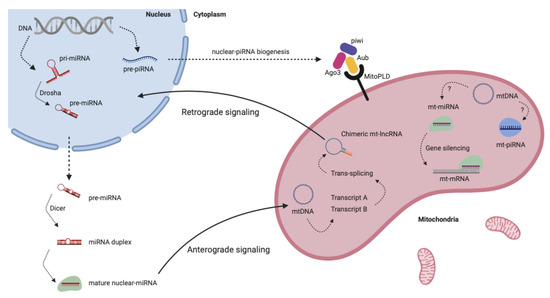Mitochondria and non-coding RNAs. Scheme showing the complex communication between nucleus and mitochondria through ncRNAs. Nuclear-ncRNAs (miRNAs, for instance) regulate mitochondrial gene expression by anterograde signaling, while mt-ncRNAs (such as lncRNAs) regulate nuclear functions by retrograde signaling. Also, mitochondria produce its own piwi-interacting RNAs (piRNAs) and participate in nuclear-piRNAs’ biogenesis.
