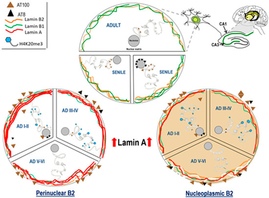 Gil, L.; Niño, S.A.; Chi-Ahumada, E.; Rodríguez-Leyva, I.; Guerrero, C.; Rebolledo, A.B.; Arias, J.A.; Jiménez-Capdeville, M.E. Perinuclear Lamin A and Nucleoplasmic Lamin B2 Characterize Two Types of Hippocampal Neurons through Alzheimer’s Disease Progression. Int. J. Mol. Sci. 2020, 21, 1841. https://doi.org/10.3390/ijms21051841