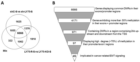 RRBS analysis of genes displaying common differentially methylated regions (DMRs) in their exons and promoter regions. (A) Venn diagram analysis of the three different comparison (M vs. E) experimental combinations used for RRBS analysis (see Table 1B for details); (B) A funnel plot indicating the selection criteria for the genes retained for further analyses, exhibiting a high degree of methylation in their promoter regions and implicated in cancer-related EMT signaling.