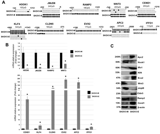 Further analysis of the sequencing data based on differentially methylated regions (DMRs) covering genes’ exons and promoter regions led to the identification of ~10,000 genes displaying DMRs for each of the three experimental combinations used (see Table 1B and Supplementary Table S1A–C). As shown in Figure 1A, consecutive Venn diagram analysis of the DMRs data from the three experimental combinations revealed 6666 genes, displaying common altered DMRs in their exons/promoter regions, following LY75-mediated EMT alterations in SKOV3 cells (see Supplementary Table S1D). Based on the 6666 gene list, we performed consecutive selections based on increasing-stringency criteria in order to retain highly hyper- or hypomethylated genes with potential role in EMT-mediated EOC dissemination (Figure 1B). Thus, we initially selected genes exhibiting more than 50% methylation in their exons/promoter regions (4171 genes), then we focused on genes displaying predominant methylation alterations in a region comprising 2 kb upstream and downstream from the transcription start site (TSS; 971 genes). Using the Integrative Genomic Viewer (IGV) software, we further selected genes with high degree (≥70%) of CpG island methylation at their promoter/exon I regions (97 genes), and finally retained 45 genes, shown previously to be implicated in cancer-related EMT signaling (see Supplementary Table S1E for the 45-gene list). Bisulfite-sequencing PCR (BSP) validation of DNA methylation status of most of the 45 genes, combined in parallel with analysis of their mRNA and protein expression levels, led to final selection of 10 genes, including HOOK1, RAMP1, JMJD8, and WNT3, hypermethylated in SKOV3-E cells, and CEND1, EVX2, CLDN5, APC2, IFFO1, and KLF4, hypomethylated in SKOV3-E cells (see Supplementary Table S1E for details). Figure 2A shows the BSP-mediated confirmation of the methylation status of these genes, which precisely correlated with both their mRNA (Figure 2B) and protein (Figure 2C) expression values in the corresponding SKOV3 cell clones.