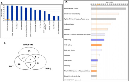 Ingenuity pathways analysis (IPA) of the 6666 common hyper- and hypomethylated genes in SKOV3-E cells. (A) Functional analysis for a dataset of the common hyper- and hypomethylated genes. Top functions that meet a Bonferroni–Holm multiple testing correction p-value of 0.05 are displayed. (B) List of selected canonical pathways that were significantly altered in SKOV3-E cells. Top functions that meet a Bonferroni–Holm multiple testing correction p-value of 0.05 are displayed. (C) Venn diagram analysis displaying common genes between the EMT, Wnt/β-catenin, and TGF-β signaling pathways, as derived from the IPA canonical pathways analysis.