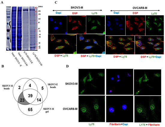 Identification of LY75 interaction partners. (A) Gel electrophoresis (Coomassie blue-stained) of anti-LY75 immunoprecipitated protein fractions in SKOV3-E and SKOV-M cells. Bands of interest are indicated by arrows. (B) Venn diagram analysis of LY75-interaction proteins identified by LC-MS-MS in SKOV3-M cells, either eluted directly from beads (SKOV3-M beads), or gel-extracted (SKOV3-M gel), compared to nonspecific LY75 interaction proteins extracted from the SKOV3-E (LY75 KD) cells. (C) Immunofluorescence analysis of LY75 and DSP cellular co-localization in SKOV3-M and OVCAR8-M cells. The green label is also indicative for a specific nuclear localization of LY75 in both epithelial ovarian cancer (EOC) cell lines. (D) Immunofluorescence analysis of LY75 and fibrillarin nucleolar co-localization in SKOV3-M and OVCAR8-M cells.