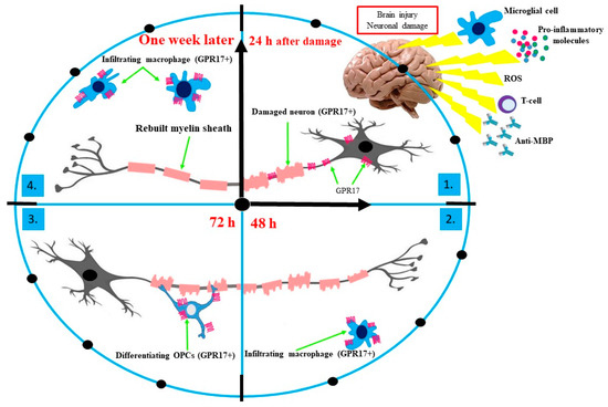 The role of GPR17 receptors as a specific marker of CNS damage has been confirmed in the latest studies, in which the level of this receptor was determined in autopsy material or from neurosurgical samples collected from patients with brain injuries. These studies have demonstrated the presence of GPR17 receptors at and around the lesions in dying neurons, activated astrocytes, and macrophages of microglia. The level of GPR17 receptors has been positively correlated with the distance from the site of damage and the degree of damage, and negatively correlated with the time elapsed from the injury [92]. To summarize, in the early stages of oligodendrocyte differentiation, the presence of GPR17 receptors stops the cells in their immature form, which is necessary for the remyelination process. Then, after reaching the critical point, the differentiating cells inhibit the synthesis of GPR17, as the continuous activity of these receptors would inhibit cell maturation. The specific role of GPR17 in neuronal damage is shown in Figure 1.