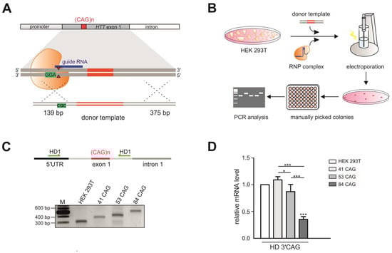 - An, M.C.; O’Brien, R.N.; Zhang, N.; Patra, B.N.; De La Cruz, M.; Ray, A.; Ellerby, L.M. Polyglutamine Disease Modeling: Epitope Based Screen for Homologous Recombination using CRISPR/Cas9 System. PLoS Curr. 2014, 6. [Google Scholar] [CrossRef] [PubMed]