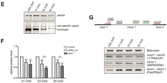 HEK 293T cells containing 16/17 CAG repeats in the HTT gene (ATCC, Manassas, VA, USA) were grown in Dulbecco’s modified Eagle’s medium (Lonza; Basel, Switzerland) supplemented with 10% fetal bovine serum (FBS) (Sigma-Aldrich, St. Louis, MO, USA), antibiotics (Sigma-Aldrich) and l-glutamine (Sigma-Aldrich). All RNA oligonucleotides were synthesized at Future Synthesis (Poznan, Poland). Briefly, RNAs were combined in annealing buffer (Thermo Fisher Scientific, Waltham, MA, USA) to a 20-µM duplex concentration and incubated at 90 °C for 1 min, followed by additional incubation at room temperature for 45 min. The sequences of the siRNAs used in this study are presented in [27,28]. At 24 h prior to transfection 3 × 105 cells were seeded on 6 cm plates. Cells transfections were performed using 100 nM siRNAs and Lipofectamine 2000 (Thermo Fisher Scientific) according to the manufacturer’s instructions. The transfection efficiency was monitored using 20 nM BlockIT fluorescent siRNA (Life Technologies, Carlsbad, CA, USA). Due to the rapid growth of the 41 CAG, 53 CAG and 84 CAG cell lines, the medium was changed after 4 h from transfection for the complete medium containing 4% FBS. The efficiency of silencing was analyzed 48 h post transfection by western blotting.