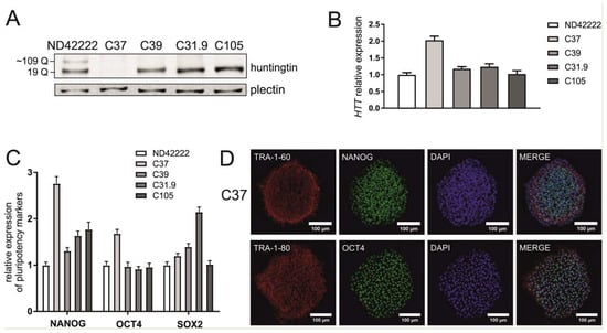 Characteristics of isogenic hiPSC clones. (A) Huntingtin protein level in HD hiPSC line with 19/109 Qs and its isogenic control cell lines was analyzed by western blotting. Plectin was used as a reference protein. (B) Analysis of the relative expression of the HTT gene by RT-qPCR in parental hiPSCs and generated cell lines. (C) The gene-edited hiPSCs maintain pluripotency as shown by expression of NANOG, OCT4 and SOX2 genes and (D) positive immunostaining for the pluripotency markers (presented for the C37 clonal cell line). The RT-qPCR results indicate the mean (± SEM) relative to expression level in ND42222, set at 1. ND42222 – parental HD hiPSCs; isogenic cell lines: C37 – HTT_KO hiPSCs, C39 – HD_19/19mut hiPSCs, C31.9 and C105 - HD_19/19 hiPSCs.