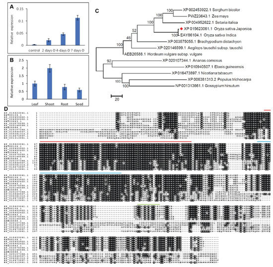 Expression pattern and sequence analysis of OsHSFA3. (A) Relative expression of OsHSFA3 under control and time course drought treatment in rice. (B) Relative expression of OsHSFA3 in different rice tissues. (C) Maximum likelihood phylogenetic tree based on amino acid sequences of OsHSFA3 and orthologs from different species. Red rhombus is the OsHSF3. (D) Multiple sequence alignment showing heat-shock factor (HSF) domain (64–157 aa, under red bar), coiled-coil domain (180–227 aa, under blue bar), and a low-complexity domain (345–357 aa, under green bar).