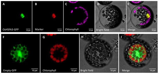 To see the subcellular localization of OsHSFA3, we first predicted its localization using bioinformatics tools. The online tool WoLF PSORT predicted its subcellular localization in the nucleus. To verify the subcellular localization, the full-length OsHSFA3 CDS without the termination codon was fused with the green fluorescence protein (GFP) coding sequence in vector pBWA(V)HS-GLosGFP to express the OsHSFA3-GFP recombinant protein. The constructed plasmid was then transformed into Arabidopsis protoplasts and observed under a confocal laser microscope. The GFP signals were colocalized with nuclear marker signals and merged well, which confirmed that OsHSPA3 was localized in the nucleus (Figure 2A–E). We also transformed a control plasmid containing only the GFP sequence without OsHSFA3 into Arabidopsis protoplasts. As expected, this construct displayed GFP signals in all parts of cell, not only in nucleus, proving the reliability of our results (Figure 2F–I).