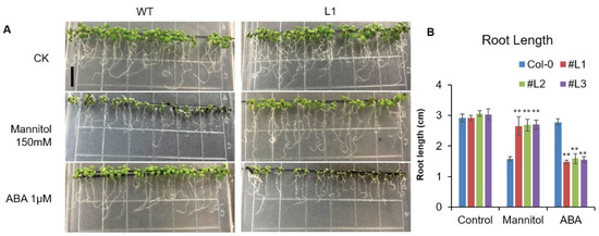 Arabidopsis serves as an excellent model plant to study the function of important genes belonging to different crop species, especially for abiotic stresses [31,34,41,45,46]. We thus overexpressed OsHSFA3 in Arabidopsis thaliana to study its response to drought stress. Root is an important agronomic trait that helps plants survive under limiting water conditions. Plants adjust their root length under drought conditions to cope with the water deficiency. We observed significant increases in the root length under mannitol treatment in transgenic Arabidopsis plants overexpressing OsHSFA3 as compared to WT (Figure 3), suggesting that OsHSFA3 may positively regulate drought tolerance. ABA is an important phytohormone that acts as a signaling molecule to activate the expression of various TFs under abiotic stress [47,48,49]. We observed a significant decrease in root length under ABA treatment in OsHSFA3-overexpressing plants as compared to WT, suggesting that OsHSFA3 is hypersensitive to ABA and ABA may regulate the expression of OsHSFA3 (Figure 3). Consistently, we observed higher ABA levels under drought stress in OsHSFA3-overexpressing plants as compared to WT (Figure 5), denoting that OsHSFA3 may work in the ABA-dependent pathway.