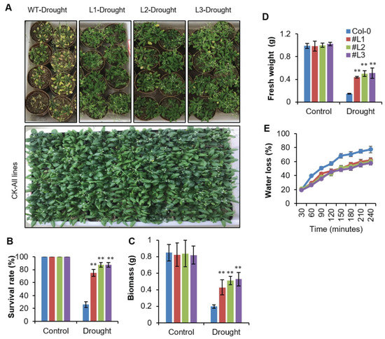 Following osmotic stress, one-month-old plants were submitted to drought stress for 20 days by terminating watering (Figure 4A). Thereafter, seedlings were transferred to normal growth conditions (watering was resumed) and grown for five days. The survival rate of WT plants was 26%, while an average of 83.3% of transgenic plants recovered (Figure 4B). Similarly, a decrease in biomass was observed under drought stress in all plants. However, the transgenic lines showed significantly higher biomass as compared to WT under drought stress (Figure 4C). Fresh weight is an important indicator of stress tolerance in plants. There was no significant difference in fresh weight among WT and transgenic plants under control conditions (Figure 4D). Nevertheless, a significantly higher fresh weight (FW) was observed in all transgenic lines as compared to WT under drought stress (Figure 4D). Water loss rates of detached leaves have been widely used to reflect drought tolerance in plants [18]. Water loss rates were assessed after every 30 min for both transgenic plants and control plants. We witnessed a steady leaf water loss with increasing time after dehydration in all plants. Notably, the water loss rate was higher in WT as compared to overexpressing transgenic lines (Figure 4E). These findings demonstrate that the transgenic lines were more resistant to dehydration and were drought stress tolerant.