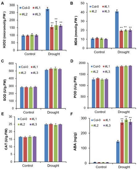 Reactive oxygen species (ROS) and antioxidant response under drought stress in OsHSFA3-overexpressing transgenic Arabidopsis plants. Quantitative measurement of H2O2 (A), malondialdehyde (B), superoxide dismutase (SOD) (C), peroxidase (POD) (D), catalase (CAT) (E) and ABA (F) in WT and OsHSFA3-overexpressing transgenic Arabidopsis plants under control and drought stress. Values indicate mean ± SE of 10 biologically independent samples. Significance of data is tested with Student’s t test. ** represents p < 0.01.