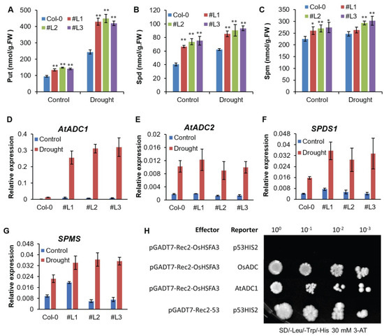 The key enzymes which regulate the polyamine biosynthesis include arginine decarboxylase (ADC), spermidine synthase (SPD) and spermine synthase(SPMS) [41]. In Arabidopsis thaliana, ADC production is regulated by two ADC paralogues, AtADC1 and AtADC2 [20]. Similarly, regulation of SPD and SPMS is controlled by the expression of the SPDS1 and SPMS genes, respectively [41]. We hypothesized that OsHSFA3 may regulate the expression of these key genes for drought tolerance. Thus, we analyzed the mRNA abundance levels of these genes under drought stress treatment in WT and OsHSFA3-overexpressing lines. The results showed that the expression of all tested genes was upregulated under drought conditions in both WT and transgenic plants, denoting that these genes are highly drought-responsive (Figure 6D–G). Notably, the mRNA abundance of the AtADC1 gene was significantly higher under drought in transgenic plants as compared to WT, indicating that AtADC1 could be directly influenced by OsHSFA3.