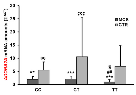 Figure 1. Mean ADORA2A mRNA expression levels in PBMC of MCS patients and healthy subjects (CTR) having different ADORA2A rs2298383 genotypes. Values shown are means ± SD. ** p < 0.01, *** p < 0.001 significant difference in comparison with CTR having the same genotype; ## p < 0.01 significant difference in comparison with CT MCS; § p < 0.05, significant difference in comparison with CC MCS; çç p < 0.01, ççç p < 0.001 significant difference in comparison with TT MCS.