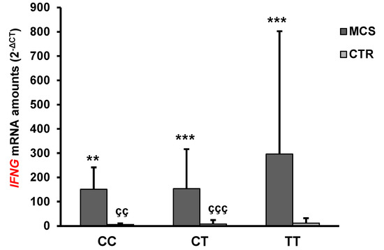 The IFNG mRNA levels in MCS TT individuals were significantly higher than those of healthy subjects (MCS TT vs CTR CC p < 0.01, vs CTR CT p < 0.001, vs CTR TT p < 0.001), while no statistically significant differences were found in comparison with MCS patients having other genotypes. No statistically significant differences in IFNG mRNA levels were found when comparing the different genotypes within the healthy cohort. Interestingly, statistically significant differences were observed between either CC or CT MCS subjects and their healthy counterpart (MCS CC vs CTR CC p < 0.01, MCS CT vs CTR CT p < 0.001).