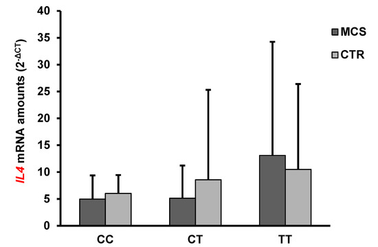 Figure 3. Mean IL4 mRNA expression levels in PBMC of MCS patients and healthy subjects (CTR) having different ADORA2A rs2298383 genotypes. Values shown are expressed as means ± SD.