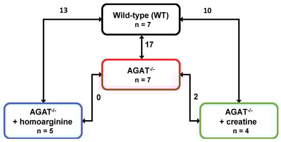 - Stockebrand, M.; Nejad, A.S.; Neu, A.; Kharbanda, K.K.; Sauter, K.; Schillemeit, S.; Isbrandt, D.; Choe, C.U. Transcriptomic and metabolic analyses reveal salvage pathways in creatine-deficient AGAT(-/-) mice. Amino Acids 2016, 48, 2025–2039. [Google Scholar] [CrossRef]
