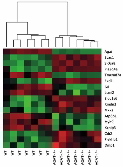 Heatmap of gene expression values depicting clustering of genes between WT and AGAT−/− in brain tissue samples. The heatmap is based on the expression of mRNAs for the significant genes. Low to high expression is represented by a change of color from green to red, respectively. Abbreviations: AGAT−/−, AGAT knock-out mice; WT, wild-type mice.