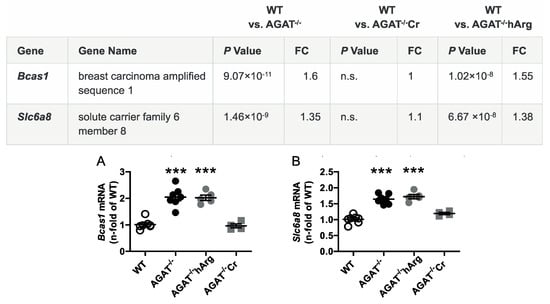 Validation of potential creatine-dependent candidate genes by qPCR. Relative mRNA expression of Bcas1 (A) and Slc6a8 (B) in the brain. Each data point represents an individual mouse. *** p < 0.001 versus WT. WT (n = 7), AGAT−/− (n = 7), AGAT−/−hArg (n = 5), AGAT−/−Cr (n = 4). The table shows the respective microarray data. Abbreviations: FC, fold change; n.s., not significant.