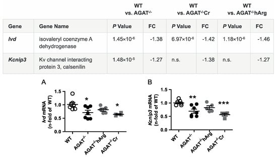 Validation of potentially hArg-dependent candidate genes by qPCR. Relative mRNA expression of Ivd (A) and Kcnip3 (B) in the brain. Each data point represents an individual mouse. * p < 0.05, ** p < 0.01 and *** p < 0.001 versus WT. WT (n = 7), AGAT−/− (n = 7), AGAT−/−hArg (n = 5), AGAT−/−Cr (n = 4). The table shows the respective microarray data. Abbreviations: FC, fold change; n.s., not significant.