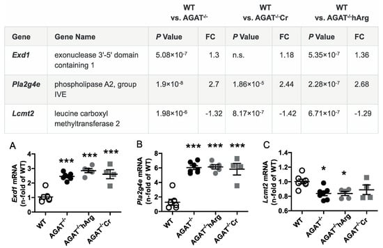 Validation of potential AGAT-dependent candidate genes by qPCR. Relative mRNA expression of Exd1 (A), Pla2g4e (B) and Lcmt2 (C) in the brain. Each data point represents an individual mouse. * p < 0.05 and *** p < 0.001 versus WT. WT (n = 7), AGAT−/− (n = 7), AGAT−/−hArg (n = 5), AGAT−/−Cr (n = 4). The table shows the respective microarray data. Abbreviations: FC, fold change; n.s., not significant.