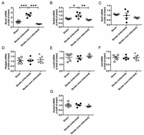 Relative mRNA expression of Bcas1 (A), Slc6a8 (B), Exd1 (C), Pla2g4e (D), Lcmt2 (E), Ivd (F) and Kcnip3 (G) candidate genes 3 days after tMCAO in C57BL/6J WT mice. Each data point represents an individual mouse. * p < 0.05, ** p < 0.01 and *** p < 0.001 versus WT. Sham (n = 5), stroke (infarcted area, n = 5), stroke (noninfarcted area, n = 5).
