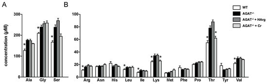 Amino acid analysis in brain tissue of WT, AGAT−/−, AGAT−/−Cr and AGAT−/−hArg mice. (A) Amino acids with high concentrations. (B) Amino acids with lower concentrations. * p < 0.05 versus AGAT−/−. Mann–Whitney U-test. Adjustment for multiple testing by Benjamini–Hochberg method. False discovery rate ≤ 0.05. Amino acid abbreviations are in three letter code.