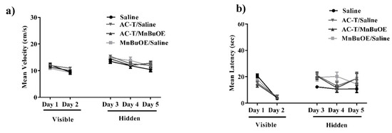 Velocity and latency to the target platform during visible and hidden training sessions. (a,b) There were no significant differences in latency or distance moved between the treatments throughout testing. Mean ± SEM (n = 8).