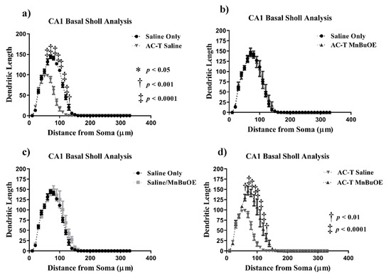 In the basal CA1 neurons, AC-T treatment produced a significant interaction between treatment and dendritic length (F = 20.87, p < 0.0001; Figure 5), dendritic complexity (F = 16.44, p < 0.0001; Figure 6c), nodes (F = 16.25, p < 0.0001), end points (F = 15.39, p < 0.0001), and surface area (F = 16.97, p < 0.0001). After Holm–Sidak multiple comparisons, the interactions were still significant. There were main effects of treatment (F (1, 4) = 114.2, p = 0.0004; Figure 5) and distance (F (2.108,8.433) = 313.7, p < 0.0001; Figure 5a). Post-hoc analysis revealed AC-T decreased dendritic length at 90 µm (Sidak, p = 0.0203), 100 µm (p = 0.0055) and 110 µm (p = 0.0406). MnBuOE treatment showed a significant interaction between treatment and dendritic complexity (F = 16.44, p < 0.0001; Figure 6c). After the Holm–Sidak post-hoc analysis, the differences between length, nodes, end points, and surface area were not significant. There was a main effect of distance (F (32,128) = 171.9, p < 0.0001; Figure 5c). Post-hoc analysis revealed MnBuOE significantly increased dendritic length at 110 µm (Sidak, p = 0.0293). After Holm-Sidak multiple comparisons, AC-T/MnBuOE treatment did not show a significant interaction between treatment and dendritic length, dendritic complexity, nodes, end points, or surface area. There was a main effect of distance (F (32, 128) = 155.1, p < 0.0001; Figure 5b). Post-hoc analysis did not reveal significant changes in Sholl length.