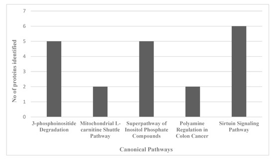 Graph of the number of proteins identified in the proteomics data set that map to the top 5 identified canonical pathways affected by AC-T treatment.