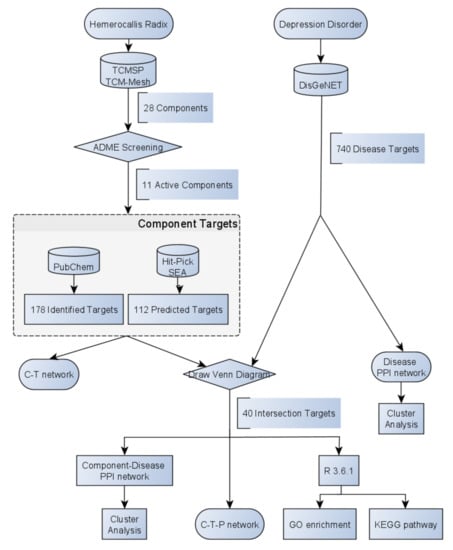 So far, several analytical methods, such as HPLC and LC-MS/MS has been reported to evaluate the effective compounds []. Nevertheless, there is no literature expounds on the underlying therapeutic mechanism of HR on DD so far. Consider the flaws of traditional experimental and analytical methods, it is difficult to uncover its association between herb-component-target-disease due to one of the greatest features of TCM system: multi-component and multi-target. Network pharmacology is an effective tool to expound the synergistic and potential mechanisms of the networks between component-target-disease and protein–protein interaction (PPI), it provides a new perspective on the therapeutic mechanisms of TCM. Therefore, the main purpose of this research is to identify effective target proteins of bioactive components in HR toward DD through network pharmacology, which is first introduced by Hopkins [,]. The work scheme of this research is shown in Figure 1, integrating pharmacokinetics synthesis screening, target identification, and network analysis.