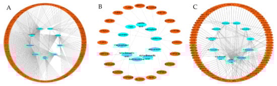 - Shannon, P.; Markiel, A.; Ozier, O.; Baliga, N.S.; Wang, J.T.; Ramage, D.; Amin, N.; Schwikowski, B.; Ideker, T. Cytoscape: A software environment for integrated models of biomolecular interaction networks. Genome Res. 2003, 13, 2498–2504. [Google Scholar] [CrossRef]