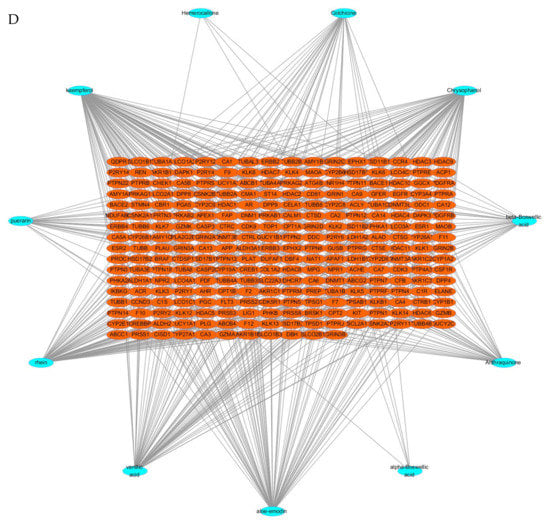 Component-target network of HR. The blue ellipse are active components of Hemerocallis Radix, and the orange eclipse nodes are the related targets. (A) The network of the identified targets. (B) The network of the predicted targets by HitPick. (C) The network of the predicted targets by similarity ensemble approach (SEA). (D) The network of all HR active component-related targets.