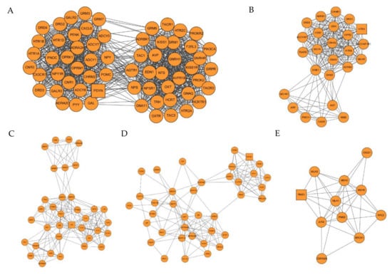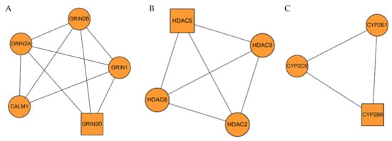 Three clusters were obtained after conducting clustering analysis for HR-DD PPI network (K-core = 2). The details are described in Figure 6 and Table 3. Cluster 1 contains 5 nodes and 9 edges with a score of 4.5. The seed node of this cluster is GRIN2D (Glutamate ionotropic receptor NMDA type subunit 2D) which has been shown to be involved in long-term potentiation, an activity-dependent increase in the efficiency of synaptic transmission thought to underlie certain kinds of memory and learning. It is also involved in the regulation of synaptic plasticity [] and modulation of chemical synaptic transmission. Cluster 2 contains 4 nodes and 6 edges with a score of 4. The seed node of this cluster is HDAC5 (Histone deacetylase 5) which is responsible for the deacetylation of lysine residues on the N-terminal part of the core histones (H2A, H2B, H3, and H4) and it is also involved in the regulation of inflammatory response. Cluster 3 contains 3 nodes and 3 edges with a score of 3. The seed node of this cluster is CYP2B6 (Cytochrome P450 2B6) which catalyze many reactions involved in drug metabolism and synthesis of cholesterol, steroids, and other lipids. It indicates that these aforementioned genes may be key to the treatment of depressive disorder with HR.