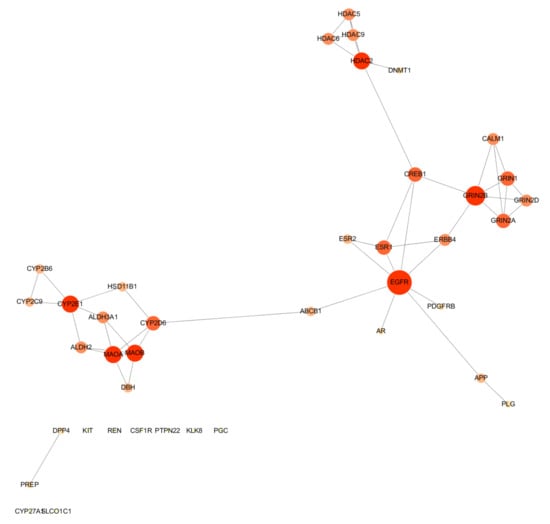 Protein–protein interaction (PPI) network of depressive disorder (DD). The closer, redder and the larger the nodes are, the higher the degree of freedom they have.