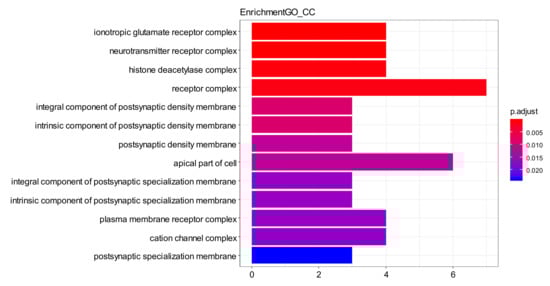 The GO enrichment analysis of the aforementioned network showed that total of 390 GO entries were obtained and top20 of each category were selected. Biology process (BP) is shown in Figure 7, including behavior (GO ID: 0007610), ionotropic glutamate receptor signaling pathway (GO ID: 0035235), regulation of synaptic plasticity (GO ID: 0048167), and response to amine (GO ID: 0014075). Cellular component (CC) is shown in Figure 8, including neurotransmitter receptor complex (GO ID: 0098878), ionotropic glutamate receptor complex (GO ID: 0008328), apical part of cell (GO ID: 0045177), intrinsic component of postsynaptic density membrane (GO ID: 0099146), and integral component of postsynaptic density membrane (GO ID: 0099061). Molecular function (MF) as shown in Figure 9, include monooxygenase activity (GO ID: 0004497), transmembrane receptor protein tyrosine kinase activity (GO ID: 0004714), and ionotropic glutamate receptor activity (GO ID: 0004970). These were all GO entries that play important parts in the central nervous system and affect mental diseases. The details of the above GO entries are described in Supplementary Table S1.