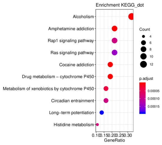 To further verify that the biological process related to the target protein is associated with the occurrence of DD, a total of 40 signal pathways (p-value cutoff = 0.05) were screened and the top10 pathways were selected using Kyoto Encyclopedia of Genes and Genomes (KEGG) pathway analysis (Figure 10). Various pathways such as alcoholism pathway, amphetamine addiction pathway, cocaine addiction pathway, drug metabolism—cytochrome P450 pathway, metabolism of xenobiotics by cytochrome P450 pathway, long-term potentiation pathway, and histidine metabolism pathway were associated with those aforementioned targets.