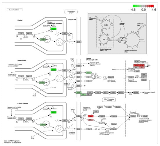 Pathway mapping of the alcoholism pathway. Green indicates down-regulation and red indicates up-regulation.
