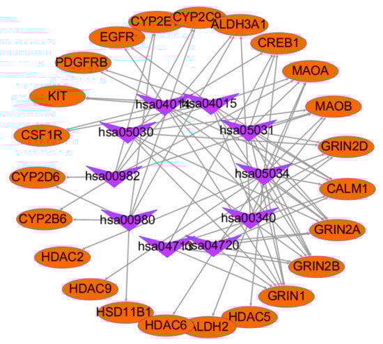The details of other related pathways are described in Table 4 and the target-pathway (T-P) network is shown in Figure 12, which contains 33 nodes including top10 KEGG pathways associated with 23 targets and 71 edges. The results show that glutamate ionotropic receptor NMDA type subunit family (GRIN1, GRIN2A, GRIN2B, and GRIN2D), monoamine oxidase family (MAOA and MAOB), and CALM1 accounted for the largest proportion. It indicates that these aforementioned genes may be key to the treatment of depressive disorder with HR.
